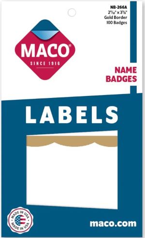Peel & Stick & Laser/Inkjet Gold Border Name Badges, 2-11/32" x 3-3/8", 100/Bx - SKU: MNB-266A - Personalize badges for conferences, conventions and parties! Easily format and print from your laser or ink jet printer or simply handwrite names. Perforations are in between each name badge for easy distribution. Not suitable for leather, suede, velvet, corduroy, silk, vinyl or plastic fabrics.