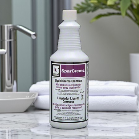 SparCreme liquid creme cleanser is a mild abrasive formulation designed to remove soap scum, stains and soil without dulling or scratching. soap film, stains, grease, rubber marks and other soil build-ups. SparCreme helps maintains the satiny smooth surface of brushed stainless steel and restores high gloss surfaces such as porcelain, ceramic tile, chrome and fiberglass.
